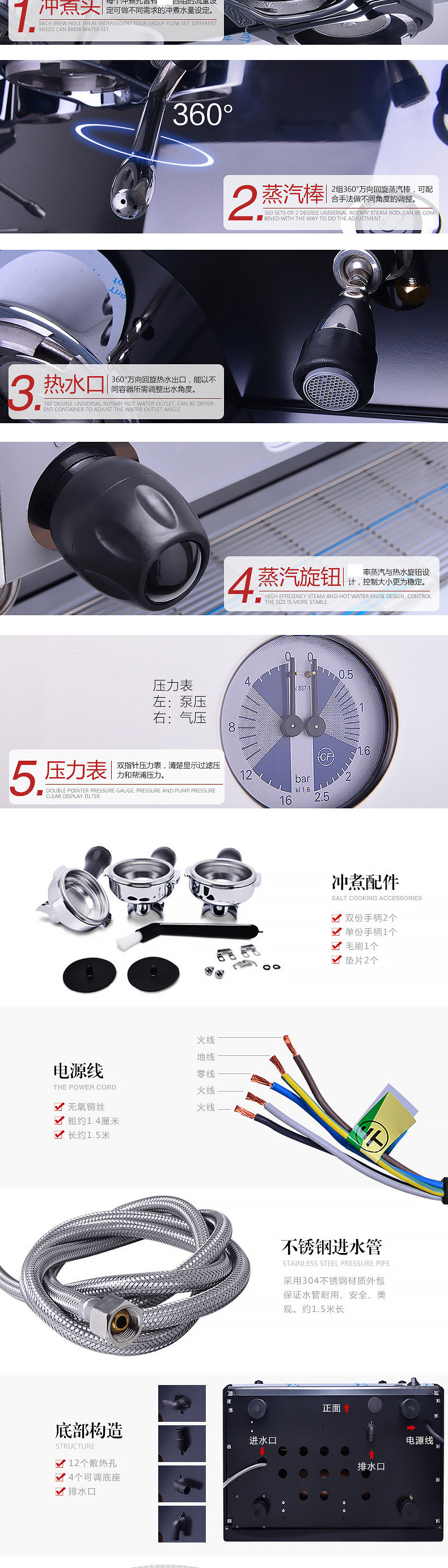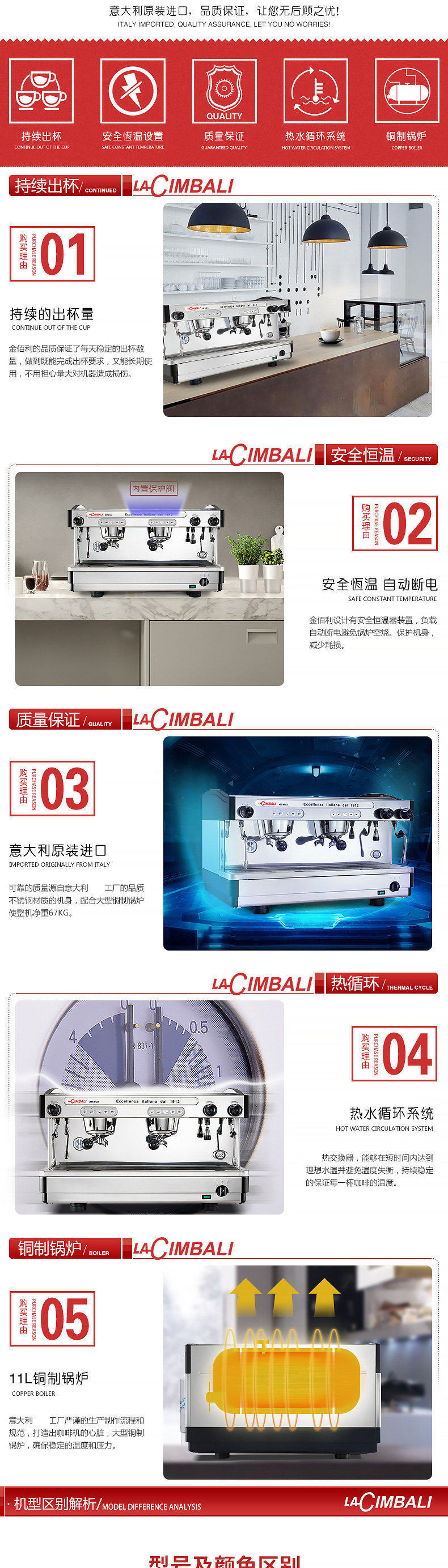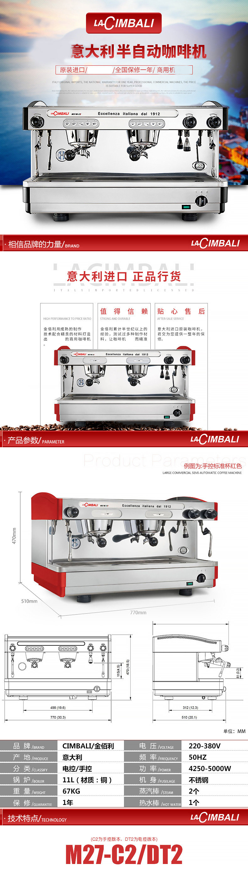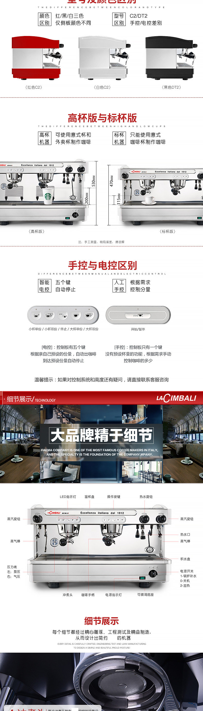雙蒸汽管功率:4.5-5.5KW 鍋爐水位顯示鍋爐容量:11升開水出口出咖啡量:240杯/小時(30cc)鍋爐蒸汽壓力顯示出開水量:200杯/小時(150cc)暖杯器自動上下水內置式增壓水泵電子控制出杯量,有記憶功能 LA CIMBALI咖啡機的歷史始于公元1912年,經過CIMBALI家族多年來的不懈努力與追求;在世界范圍內,CIMBALI咖啡機已成為意式咖啡機的代名詞。時至今日,作為商用咖啡設備CIMBALI公司的產品通過其強大的銷售網絡,已銷售到全世界超過100多個國家和地區。 CIMBALI的成功,取決于高質量的產品,高效率的售后服務以及對新產品、新技術的高投入。從而保證了其在產品技術上的領導地位。行業主導地位意味著CIMBALI不僅要高度重視員工的素質培訓,更要致力于客戶的專業知識培訓,使他們憑著對機器及咖啡更深的了解,向他們的客戶提供服務,讓世人品味意式咖啡的魅力。毫無疑問,Espresso和Cappuccino是我們生活的一大樂趣,但它們已不是一般意義的飲品,而是餐桌上的團隊精神,商務會議桌上的愉悅以及為友情的標志。為了這種含義,一杯Espresso是何其重要!因此需要控制好咖啡粉粗細、咖啡粉的份量、粉餅的壓力、水溫、水壓等等,品嘗一杯入口醇厚、滿嘴芳香的咖啡,背后有許許多多的故事。這需要經驗,這是名為CIMBALI的意大利公司近一個世紀的名聲所在,我們的員工以熱情和驕傲創造著咖啡機的歷史,他們制造的機器使其在全球的分銷商因向客戶提供了服務而備受尊敬。 隨著時間的推移,CIMBALI之DOLCEVITA (甜蜜人生)系列產品又將以全新的面貌展現于世人面前。
