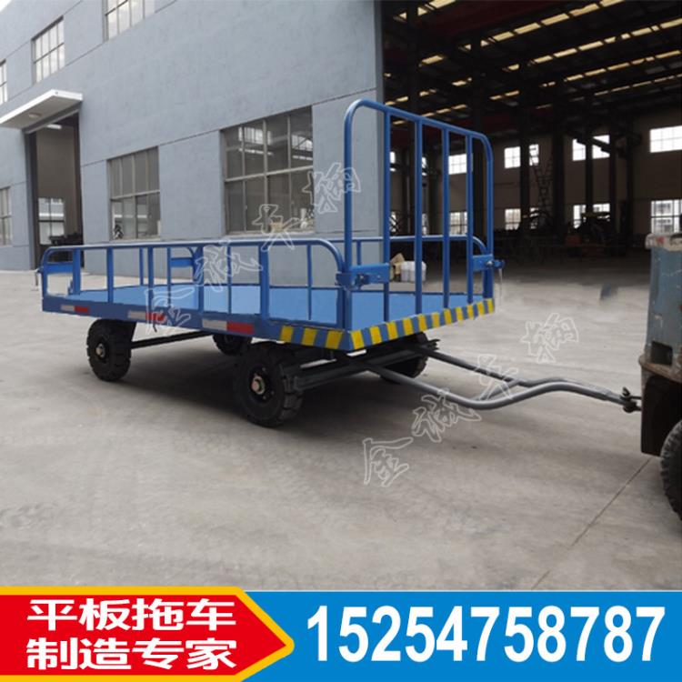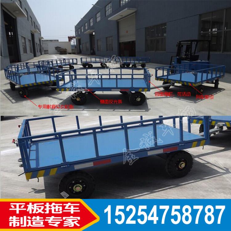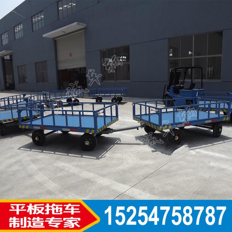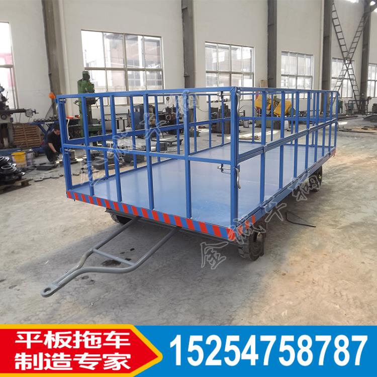 圍板是圍欄,圍板式圍欄主要是就是圍欄式鋼板式,不是框架式,比框架式的安全系統高,更能防止小型散裝貨物掉落。行李牽引平板拖車是物流、機場、港口、車站專用平板車,實心輪胎列車牽引載重3噸,可定制。